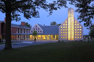 That means no fixed pews. Instead, light chairs - 190 of them - can be quickly rearranged into new formations. "It's a New England meeting house for the 21st century," says architect Donham. Like the meeting house, the chapel can be used for community events as well as religious services. On a recent visit, the chapel was set up for Christians, with a handsome (though very modest) maple and cherry pulpit and a couple of prominent crosses, but these and other symbols were mounted in a way that makes them easily moveable.